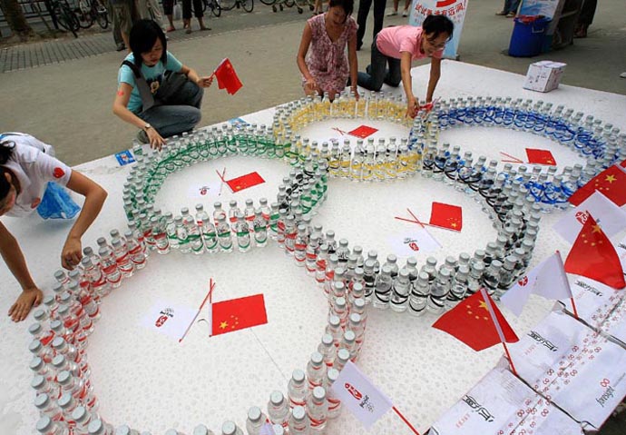 近日,人們在上海街頭用飲料瓶擺出奧運(yùn)五環(huán)的圖案。隨著2008北京奧運(yùn)會的臨近,上海民眾以多種形式表達(dá)對奧運(yùn)的熱切期盼之情。