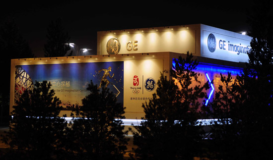 | 連日來,夜幕下的奧林匹克公園熒光束束,包括強(qiáng)生、大眾、通用電器在內(nèi)的許多北京奧運(yùn)會(huì)合作伙伴企業(yè)在奧林匹克公園的公共區(qū)內(nèi)各自加緊打造自己的展示間,用五顏六色的裝飾迎接奧運(yùn)會(huì)的到來。圖為通用電氣公司的展示間。新華社記者