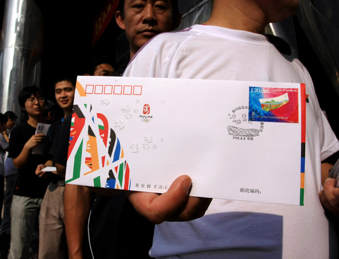 8月8日,合肥市民排隊(duì)購買奧運(yùn)會開幕式相關(guān)郵品。當(dāng)日,《第29屆奧林匹克運(yùn)動會開幕式》紀(jì)念明信片在全國發(fā)行。此外,《第29屆奧林匹克運(yùn)動會開幕紀(jì)念》郵票及首日封等同時(shí)發(fā)售。