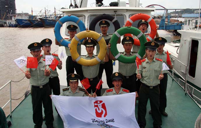 8月8日,在開始海上巡查前,浙江舟山群島邊防官兵在公安邊防艇甲板上用五色救生圈擺出“奧運(yùn)五環(huán)”。當(dāng)日,浙江舟山群島22個海島邊防哨卡同時舉行升國旗儀式,迎接并祝福北京奧運(yùn)會。