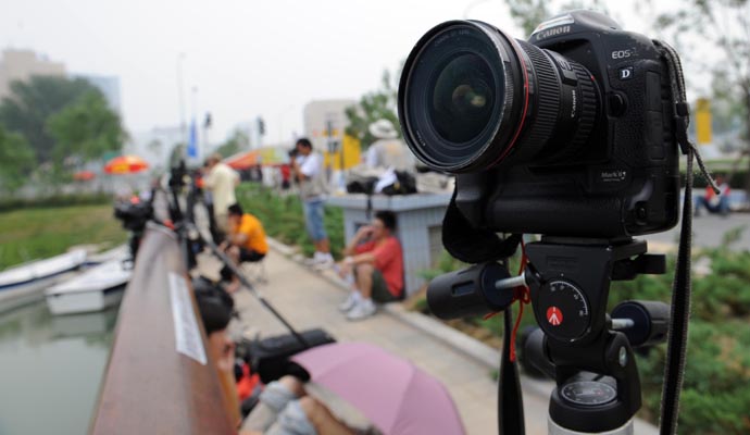 8月8日,眾多攝影記者提前在國家體育場——“鳥巢”南側(cè)架好攝影器材,為晚上的開幕式做準(zhǔn)備。此刻距北京奧運會開幕還有不到6個小時。