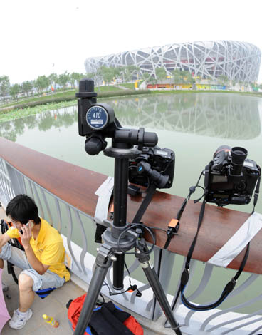 8月8日13時許,一名攝影師在國家體育場——“鳥巢”邊架起相機等待拍攝開幕式上燃放的煙花。此刻距北京奧運會開幕還有不到7個小時。