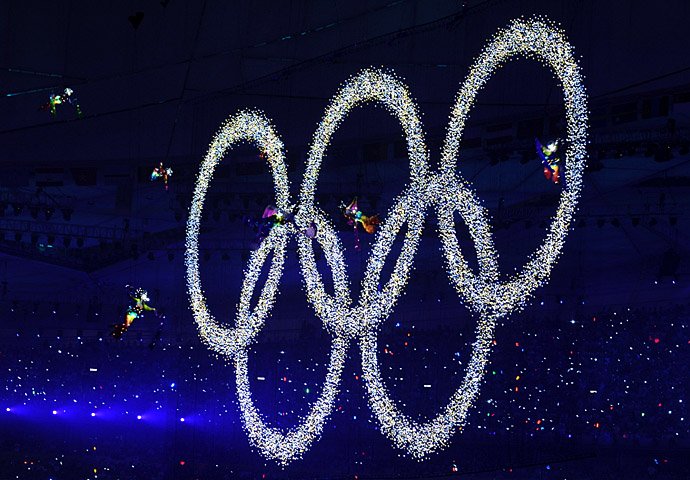 8月8日晚8時(shí),第29屆夏季奧林匹克運(yùn)動(dòng)會(huì)在國家體育場(chǎng)——“鳥巢”隆重開幕。這是開幕式上閃閃發(fā)光的夢(mèng)幻五環(huán)出現(xiàn)在“鳥巢”。