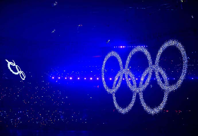 8月8日晚8時,第29屆夏季奧林匹克運動會在國家體育場——“鳥巢”隆重開幕。這是開幕式上閃閃發(fā)光的夢幻五環(huán)出現(xiàn)在“鳥巢”。