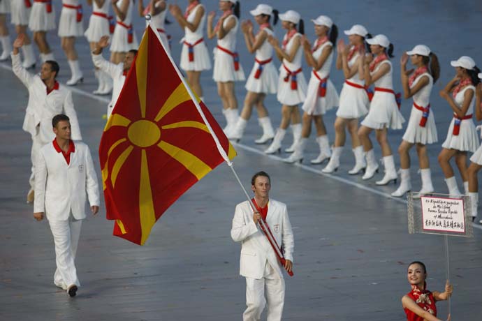 8月8日晚8時,第29屆夏季奧林匹克運(yùn)動會在國家體育場——“鳥巢”隆重開幕。這是馬其頓代表團(tuán)在開幕式上入場。