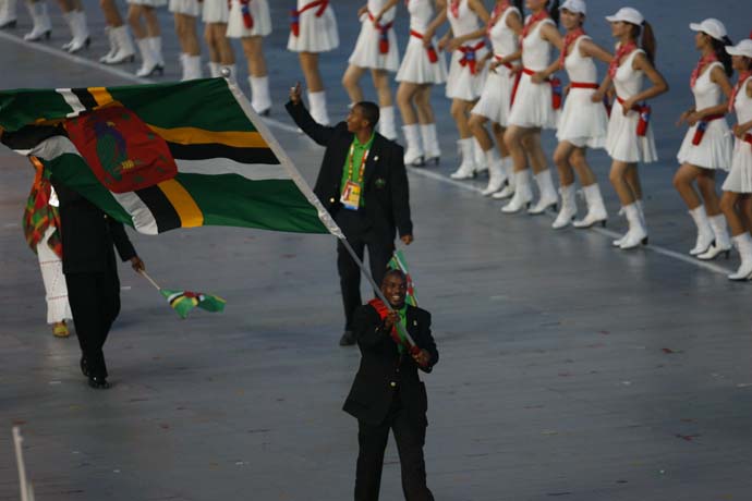 8月8日晚8時,第29屆夏季奧林匹克運動會在國家體育場——“鳥巢”隆重開幕。這是多米尼克代表團在開幕式上入場。