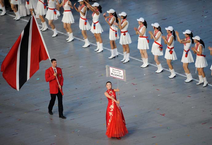 8月8日晚8時,第29屆夏季奧林匹克運(yùn)動會在國家體育場——“鳥巢”隆重開幕。這是特立尼達(dá)和多巴哥代表團(tuán)在開幕式上入場。