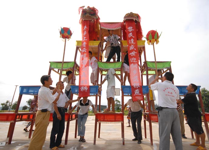 8月9日,村民搭臺(tái)準(zhǔn)備表演高臺(tái)舞獅。