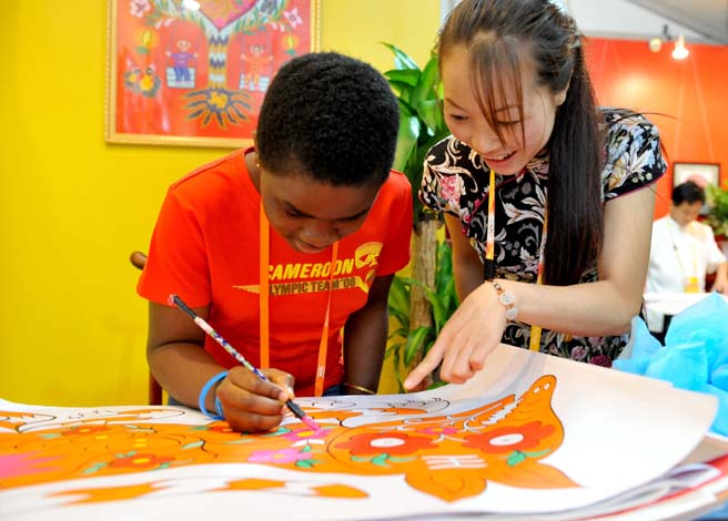 8月10日,來自喀麥隆的埃萊克塔(左)在北京奧運(yùn)村商業(yè)文化街學(xué)畫農(nóng)民畫。當(dāng)日,北京2008奧林匹克青年?duì)I的481名營員參觀了北京奧運(yùn)村。北京2008奧林匹克青年?duì)I于8月6日在北京正式開營。本屆青年?duì)I將圍繞體驗(yàn)奧運(yùn)、交流學(xué)習(xí)、了解中國三條主線開展活動(dòng)。