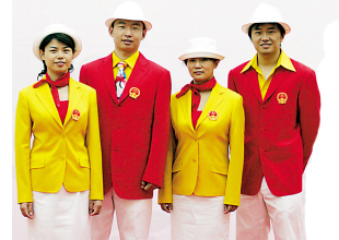 中國運(yùn)動(dòng)員的禮儀裝備采用傳統(tǒng)的“紅黃配”,男裝以紅上裝配黃襯衫,奧運(yùn)五環(huán)領(lǐng)帶;女裝以黃上裝配紅吊帶,祥云絲巾;下裝、禮帽、腰帶及禮儀鞋則均以白色為主。技術(shù)官員上裝及下裝的顏色以藏蘭色為主色調(diào),內(nèi)配白色襯衫。