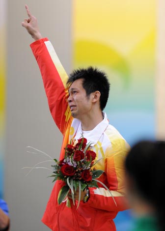 8月11日,中國(guó)選手朱啟南在頒獎(jiǎng)典禮上流淚。當(dāng)日,北京奧運(yùn)會(huì)射擊男子10米氣步槍決賽在北京射擊館舉行,中國(guó)選手朱啟南以699.7環(huán)的成績(jī)獲得亞軍。