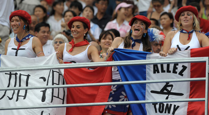 8月11日,幾名“盛裝”的外國觀眾在順義水上公園為皮劃艇激流回旋選手加油助威。