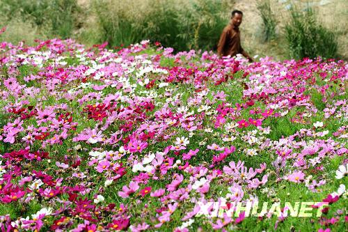 地處河西走廊的張掖市高臺(tái)縣新壩鄉(xiāng)官溝村農(nóng)民種植的用于制種的波斯菊(8月6日攝)。