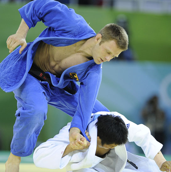 8月12日,在北京奧運(yùn)會(huì)柔道男子81公斤級(jí)決賽中,德國選手奧勒·比朔夫戰(zhàn)勝韓國選手金宰范,奪得冠軍。