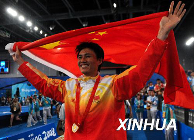 8月12日,中國選手仲滿披上五星紅旗,慶祝勝利。當晚,中國選手仲滿在國家會議中心擊劍館舉行的北京奧運會男子佩劍個人決賽中戰(zhàn)勝法國選手尼古拉·洛佩,獲得冠軍。這是中國男子擊劍在奧運歷史上的第一金。新華社記者