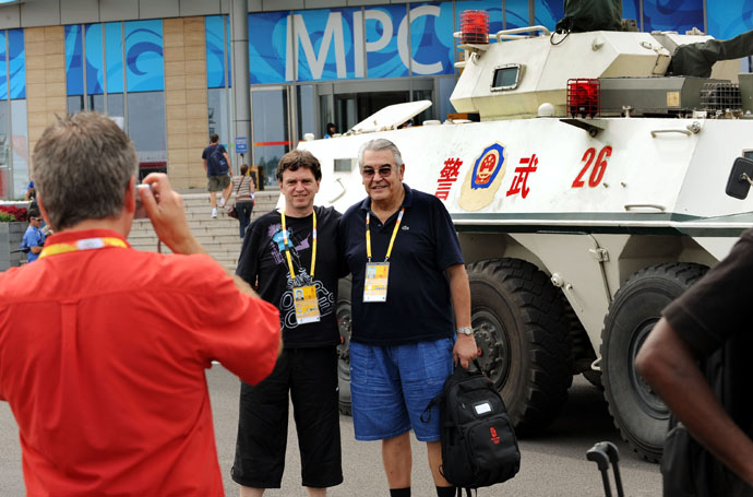 8月12日,兩位記者在裝甲運(yùn)兵車前合影留念。當(dāng)日,一輛安保裝甲運(yùn)兵車停在北京奧運(yùn)會(huì)新聞中心(MPC)安檢口,成為媒體關(guān)注的焦點(diǎn)。許多記者還饒有興趣地與之合影留念,感受一下這位“裝甲明星”的威風(fēng)。