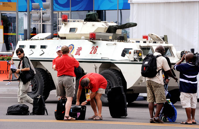 8月12日,記者在拍攝裝甲運(yùn)兵車。當(dāng)日,一輛安保裝甲運(yùn)兵車停在北京奧運(yùn)會新聞中心(MPC)安檢口,成為媒體關(guān)注的焦點(diǎn)。許多記者還饒有興趣地與之合影留念,感受一下這位“裝甲明星”的威風(fēng)。