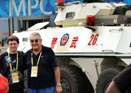 8月12日,,一輛安保裝甲運(yùn)兵車停在北京奧運(yùn)會(huì)新聞中心(MPC)安檢口,成為媒體關(guān)注的焦點(diǎn)。許多記者還饒有興趣地與之合影留念,感受一下這位“裝甲明星”的威風(fēng)。