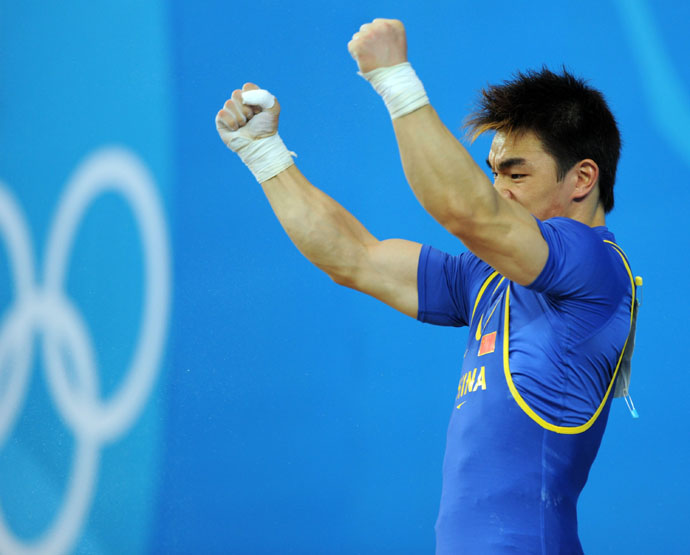 8月12日,中國(guó)運(yùn)動(dòng)員廖輝慶祝勝利。當(dāng)日,廖輝在北京奧運(yùn)會(huì)舉重男子69公斤級(jí)決賽中以348公斤的總成績(jī)獲得金牌。