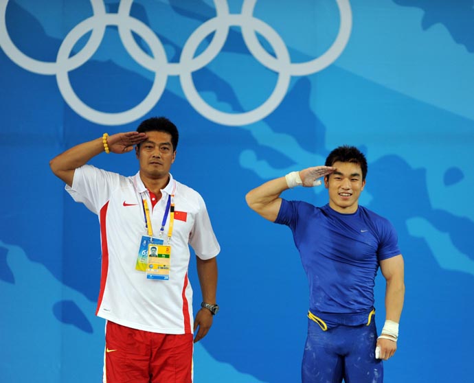 8月12日,中國選手廖輝(右)和教練于杰在奪冠后向觀眾行軍禮。當(dāng)日,廖輝在北京奧運(yùn)會(huì)舉重男子69公斤級(jí)決賽中以348公斤的總成績(jī)獲得金牌。