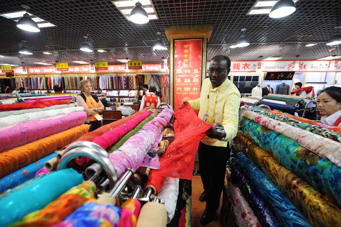 8月13日,一位外國客人在秀水街挑選綢緞。