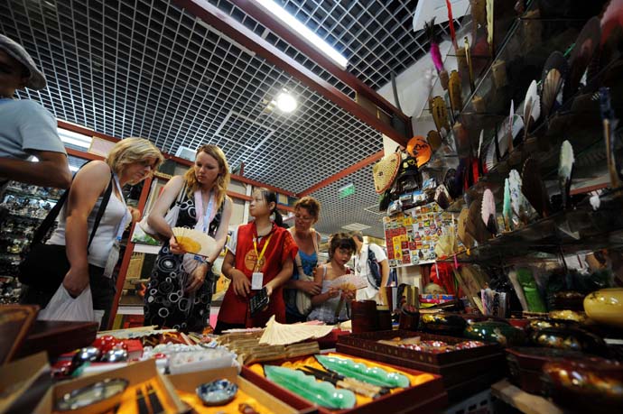 8月13日,國外游客在北京秀水街挑選中國傳統(tǒng)工藝品。