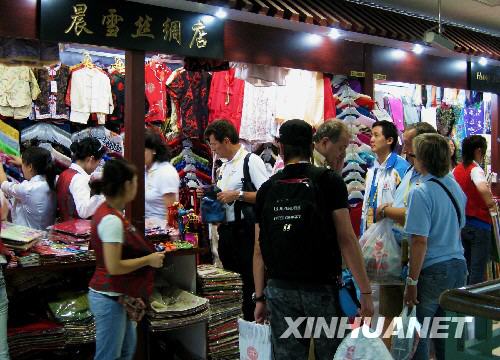 8月14日,外國游客在北京秀水街挑選絲綢服裝。秀水街是中國改革開放以來北京一處聞名中外的服裝和工藝品市場,這里物美價廉的商品深受國內(nèi)外游客喜愛,其“絲綢街”的絲綢更是受到外國游客的青睞。