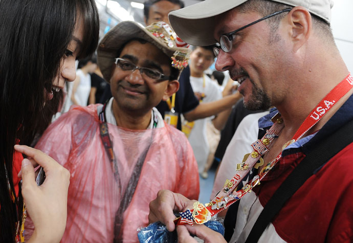8月14日,在北京地鐵里,“章迷”們?cè)诨Q奧運(yùn)紀(jì)念章。奧運(yùn)會(huì),也是來(lái)自世界各地的奧運(yùn)紀(jì)念章迷們的盛會(huì)。大家在北京互換紀(jì)念章,“以章會(huì)友”,共同享受奧運(yùn)帶來(lái)的快樂(lè)。