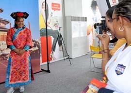 北京奧運村商業(yè)文化街照相館里的中國古代服飾受到外國賓客的青睞。