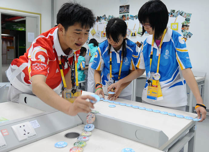 8月12日,參與志愿者崗位標識徽章設計的任煒、吳雪楊、于婧(從左至右)等在整理志愿者崗位標識徽章。