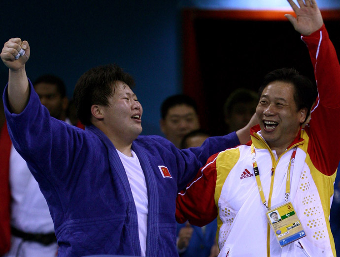 8月15日,佟文(左)在獲勝后興奮地歡呼。當日,在北京奧運會柔道女子78公斤以上級決賽中,中國選手佟文戰(zhàn)勝日本選手塚田真希,奪得冠軍。