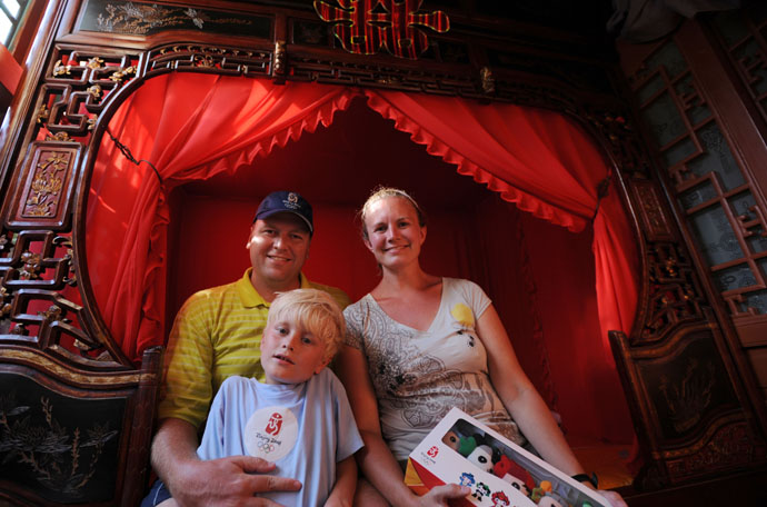 8月15日,澳大利亞游客在什剎海南官房胡同39號(hào)“奧運(yùn)人家”的中式婚床上合影。8月8日北京奧運(yùn)會(huì)開(kāi)幕后,北京市的“奧運(yùn)人家”成為中外游客的關(guān)注焦點(diǎn)。位于什剎海附近的“奧運(yùn)人家”游客絡(luò)繹不絕,游客在這里能夠深切感受到老北京所特有的皇城文化與傳統(tǒng)特色。
