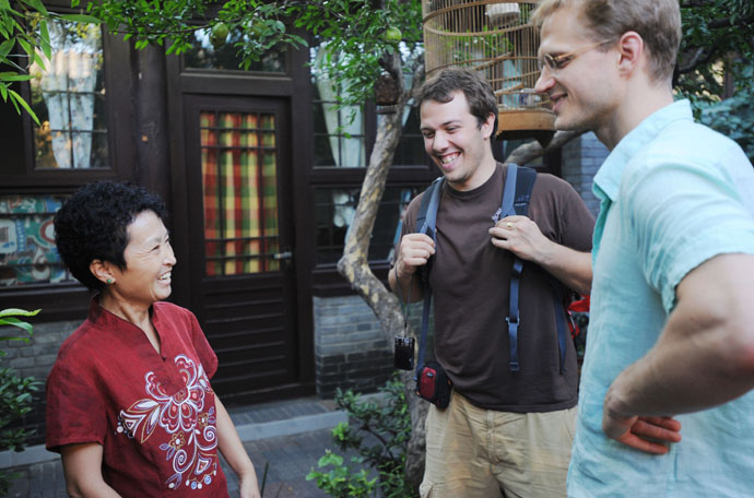 8月15日,什剎海大金絲胡同12號(hào)“奧運(yùn)人家”女主人王志喜用流利的英文向美國(guó)游客介紹中國(guó)建筑文化。8月8日北京奧運(yùn)會(huì)開(kāi)幕后,北京市的“奧運(yùn)人家”成為中外游客的關(guān)注焦點(diǎn)。位于什剎海附近的“奧運(yùn)人家”游客絡(luò)繹不絕,游客在這里能夠深切感受到老北京所特有的皇城文化與傳統(tǒng)特色。