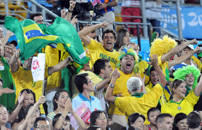 8月16日,巴西球迷來到朝陽公園沙灘排球場觀看比賽。當天,這里舉行了男女16強復(fù)賽。