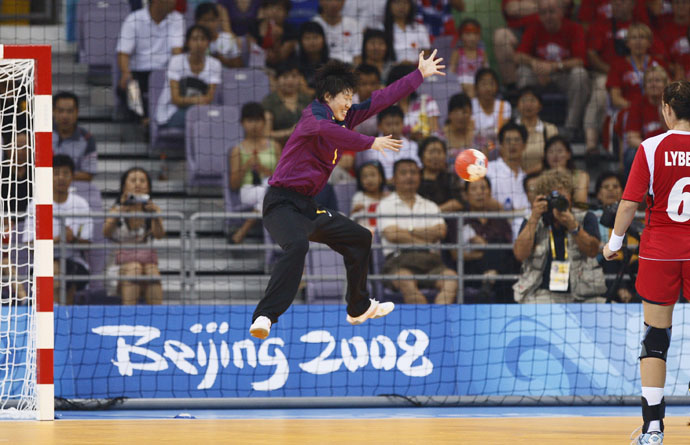 8月9日,中國(guó)隊(duì)守門員劉桂妮在比賽中撲救。當(dāng)日,在北京奧運(yùn)會(huì)女子手球預(yù)賽A組比賽中,中國(guó)隊(duì)以23比30負(fù)于挪威隊(duì)。