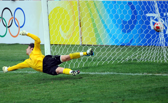 8月10日,新西蘭國奧隊門將斯普利在撲救巴西隊球員羅納爾迪尼奧的點球中失利。當日,在沈陽奧體中心舉行的奧運會男子小組賽C組比賽中,巴西國奧隊以5比0戰(zhàn)勝新西蘭國奧隊。