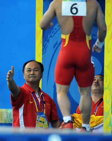 8月10日,中國(guó)舉重運(yùn)動(dòng)員龍清泉的教練陳文斌(左)在場(chǎng)邊迎接弟子。首次參加國(guó)際大賽的龍清泉在北京奧運(yùn)會(huì)男子舉重56公斤級(jí)決賽中以總成績(jī)292公斤奪得冠軍。