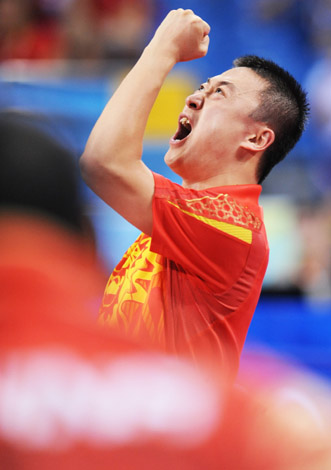 8月16日,中國選手馬琳在比賽中慶祝得分。當日,中國隊在北京奧運會乒乓球男團半決賽中以3比0戰(zhàn)勝韓國隊,挺進決賽,將于18日與德國隊爭奪金牌。