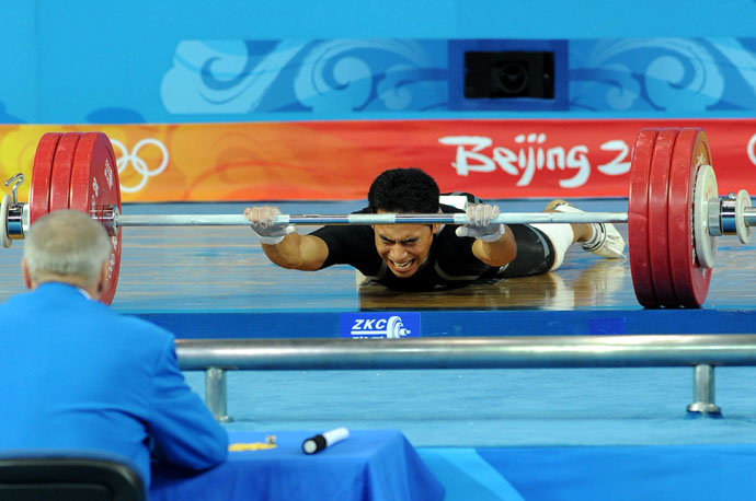 8月12日,雅典奧運(yùn)會(huì)男子舉重69公斤級(jí)亞軍得主、韓國選手李培永在北京奧運(yùn)會(huì)舉重男子69公斤級(jí)決賽挺舉比賽中失誤,但仍緊緊抓住杠鈴。李培永在挺舉的三次試舉中,因?yàn)榈谝慌e受傷而導(dǎo)致最后兩舉功敗垂成,與獎(jiǎng)牌失之交臂。