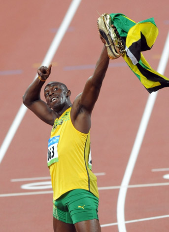 8月16日,牙買加選手尤塞恩·博爾特在比賽后向觀眾致意。