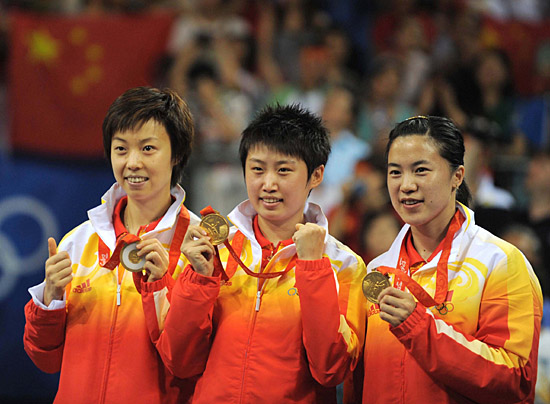 在17日晚舉行的北京奧運(yùn)會(huì)乒乓球女子團(tuán)體決賽中,中國(guó)隊(duì)擊敗新加坡隊(duì)獲得金牌。 第一盤(pán)由中國(guó)隊(duì)的王楠對(duì)陣新加坡隊(duì)的馮天薇,王楠在先失一局的情況下連扳三局,以3:1戰(zhàn)勝對(duì)手為中國(guó)隊(duì)拿下第一分。 第二盤(pán)比賽中,世界排名第一的張怡寧出場(chǎng),迎戰(zhàn)世界排名第六的新加坡名將李佳薇。張怡寧延續(xù)了隊(duì)友王楠的獲勝軌跡,第一局9:11失利,然后連勝三局,以3:1取得第二盤(pán)的勝利。 在第三盤(pán)雙打比賽中,由中國(guó)隊(duì)的張怡寧/郭躍對(duì)陣新加坡隊(duì)的李佳薇/王越古,張怡寧/郭躍直落三局以3:0取勝。 中國(guó)隊(duì)最終以總比分3:0戰(zhàn)勝新加坡隊(duì),獲得北京奧運(yùn)會(huì)乒乓球女子團(tuán)體金牌。