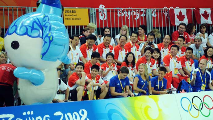 8月17日,福娃“貝貝”與中國跳水隊隊員和英國跳水隊隊員齊為選手助威。當(dāng)日,北京奧運會女子3米跳板決賽在國家游泳中心——“水立方”舉行。