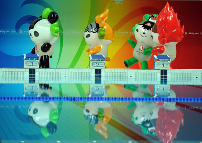 8月17日,福娃“晶晶”、“迎迎”、“妮妮”和“歡歡”(從左至右)為選手助威。當(dāng)日,北京奧運(yùn)會(huì)女子3米跳板決賽在國(guó)家游泳中心——“水立方”舉行。