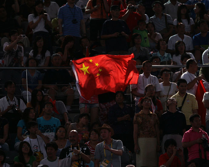 8月17日,北京奧運會體操單項決賽在國家體育館進行。這是觀眾在看臺上舞動五星紅旗為中國運動員加油。