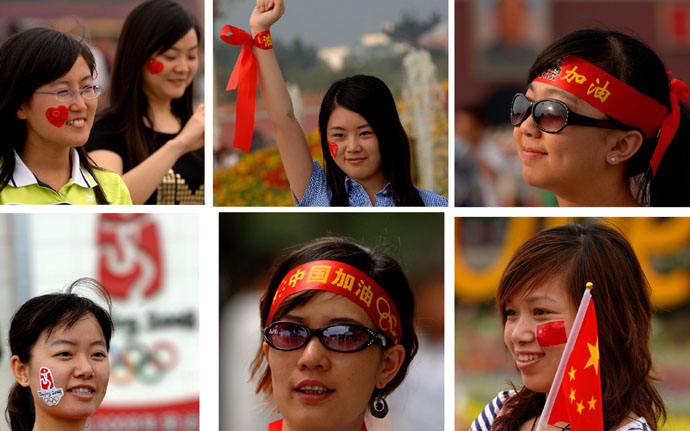這是在北京天安門廣場(chǎng)為奧運(yùn)加油的姑娘們(拼版照片,8月17日攝)。 漫步北京街頭,不時(shí)可見北京市民、游客手中的國(guó)旗、臉上的貼紙,他們用這種時(shí)尚的方式為中國(guó)運(yùn)動(dòng)員加油、為奧運(yùn)喝彩。