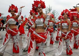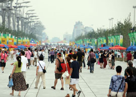 8月17日,演員在奧林匹克公園的景觀大道行進(jìn)表演。當(dāng)日,4萬觀眾來到北京奧林匹克公園游覽。占地1000多公頃的北京奧林匹克公園包括奧林匹克森林公園、景觀大道、國家體育館、國家體育場(chǎng)、國家游泳中心和運(yùn)動(dòng)員村等設(shè)施。
