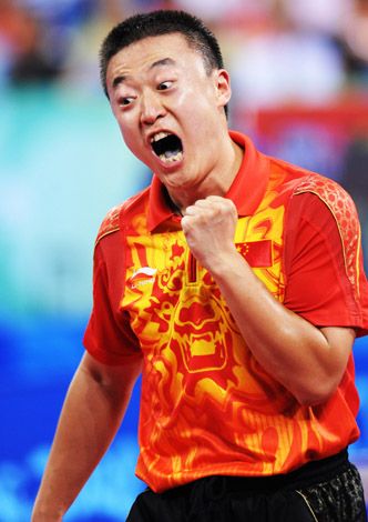 8月18日,中國選手馬琳慶祝得分。當(dāng)日,中國隊在北京奧運(yùn)會乒乓球男子團(tuán)體決賽中以3比0戰(zhàn)勝德國隊,摘得金牌。