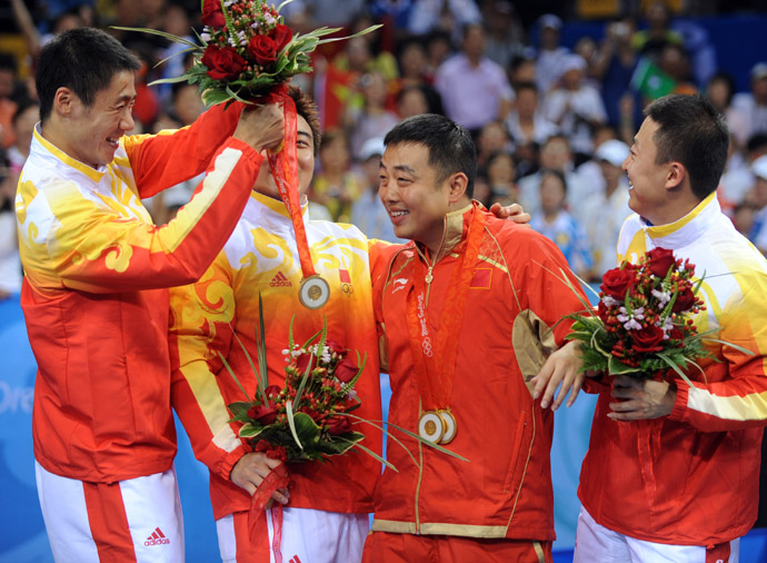8月18日,中國隊員馬琳(右一)、王皓(左二)、王勵勤(左一)把金牌掛到主教練劉國梁的脖子上。當(dāng)日,中國隊在北京奧運會乒乓球男子團體決賽中以3比0戰(zhàn)勝德國隊,摘得金牌。