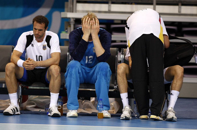 8月18日,德國(guó)隊(duì)門將約翰內(nèi)斯·比特(左二)雙手掩面坐在條凳上。