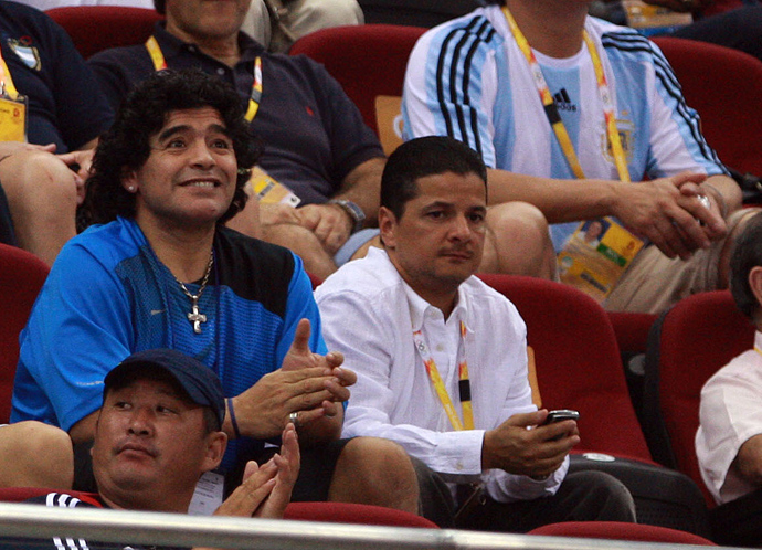 8月18日,阿根廷著名足球明星馬拉多納(左三)前來觀看阿根廷對俄羅斯的比賽。